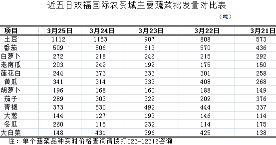 根据重庆市农业信息中心对我市最大蔬菜批发市场--双福国际农贸城蔬菜批发量监测,该市场3月25日监测的40个品种,总体批发量与上一日比减少7.51%;与上一周日均量比明显增加11.69%。日批发量在100吨及以上的大宗蔬菜批发量与上一日比明显减少12.98%,与上一周日均量比明显增加17.50%。