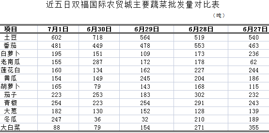 根据重庆市农业信息中心对我市最大蔬菜批发市场--双福国际农贸城蔬菜批发量监测,该市场7月1日监测的42个品种,总体批发量与上一日比略增2.34%;与上一周日均量比减少9.03%。日批发量在100吨及以上的大宗蔬菜批发量与上一日比增加7.76%,与上一周日均量比减少9.26%。