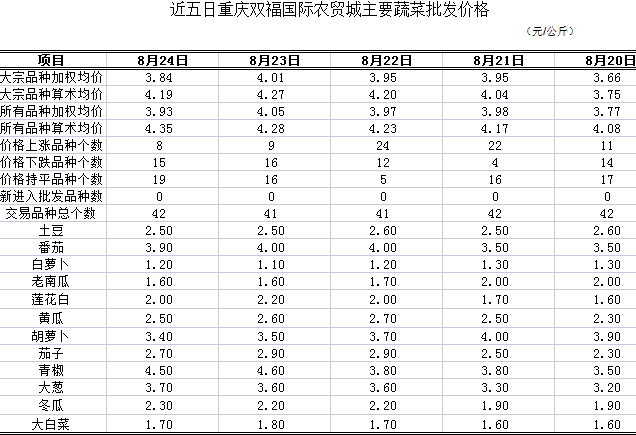 双福国际农贸城2022年8月24日蔬菜算数批发价环比平稳