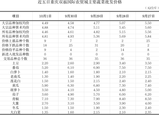 双福国际农贸城2025年10月1日蔬菜算数批发价环比略跌