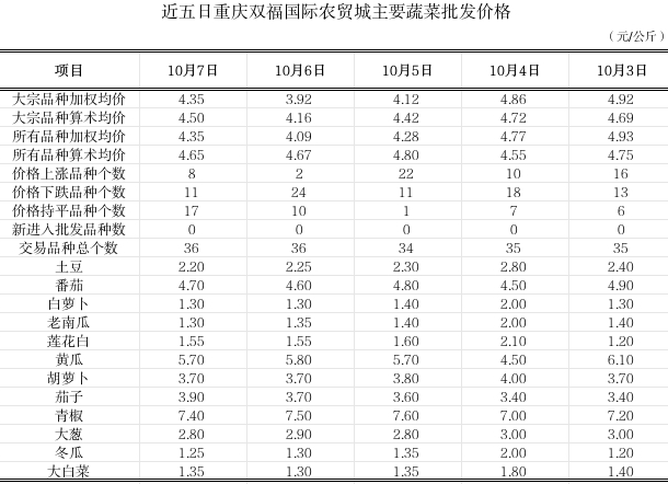 双福国际农贸城2025年10月7日蔬菜算数批发价环比平稳