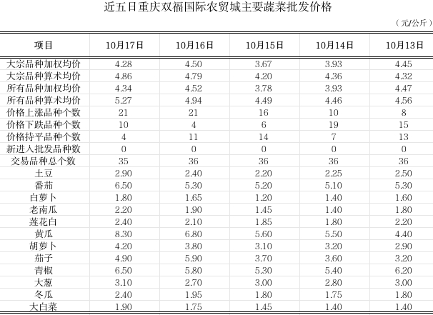 双福国际农贸城2025年10月17日蔬菜算数批发价环比上涨