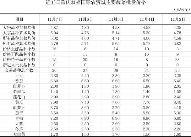 双福国际农贸城2025年11月7日蔬菜算数批发价环比平稳