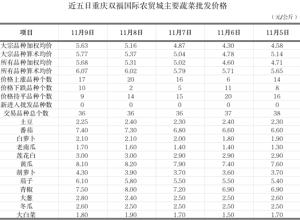 根据重庆市农业信息中心对我市最大蔬菜批发市场--双福国际农贸城蔬菜批发价格监测,当日市场36个监测品种,蔬菜总体算数均价6.07元(公斤价,以下同),与上一日比上浮0.83%、表现平稳;与上一周日均价比略涨2.02%。总体加权均价5.68元,与上一日比上涨6.97%;与上一周日均价比明显上涨13.37%。当日大宗交易品种19个,大宗蔬菜算术均价与上一日比上涨7.45%;加权均价与上一日比上涨9.11%。