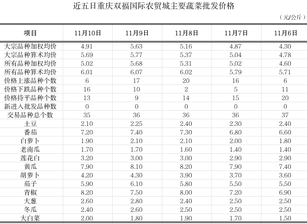 双福国际农贸城2025年11月10日蔬菜算数批发价环比平稳