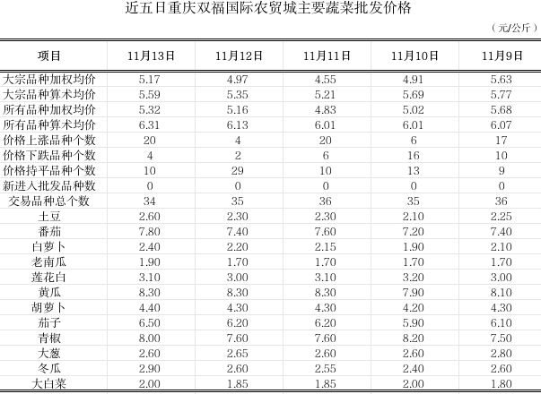 双福国际农贸城2025年11月13日蔬菜算数批发价环比平稳