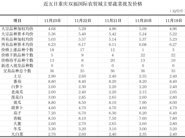 双福国际农贸城2025年11月23日蔬菜算数批发价环比平稳