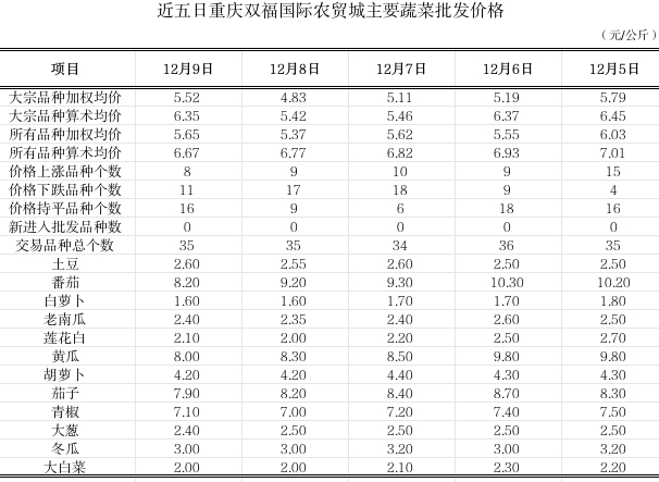 双福国际农贸城2025年12月9日蔬菜算数批发价环比平稳