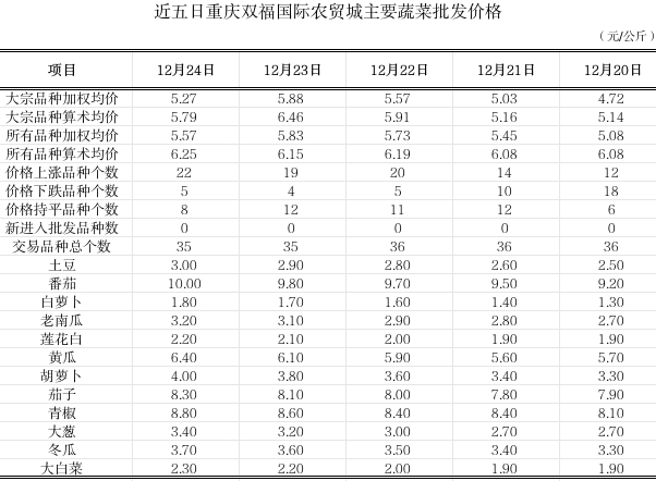 双福国际农贸城2025年12月24日蔬菜算数批发价环比平稳