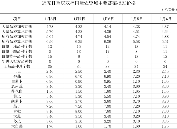 双福国际农贸城2026年1月8日蔬菜算数批发价环比平稳