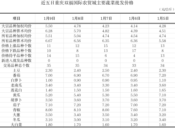 双福国际农贸城2026年1月9日蔬菜算数批发价环比持平