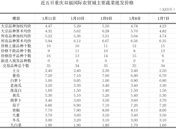 双福国际农贸城2026年1月11日蔬菜算数批发价环比平稳