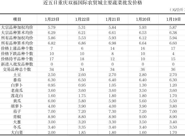双福国际农贸城2026年1月23日蔬菜算数批发价环比平稳