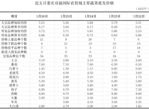 双福国际农贸城2026年1月26日蔬菜算数批发价环比平稳
