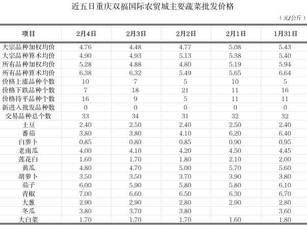 双福国际农贸城2026年2月4日蔬菜算数批发价环比平稳
