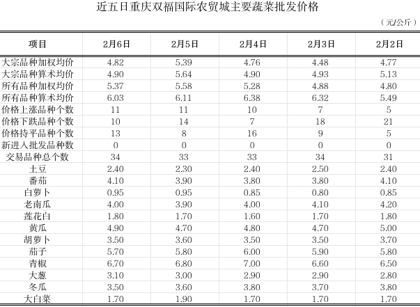 双福国际农贸城2026年2月6日蔬菜算数批发价环比平稳