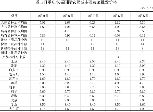 双福国际农贸城2026年2月9日蔬菜算数批发价环比平稳