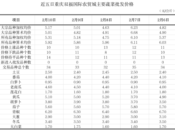 双福国际农贸城2026年2月10日蔬菜算数批发价环比平稳