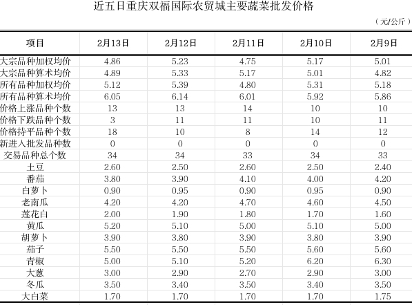 双福国际农贸城2026年2月13日蔬菜算数批发价环比平稳