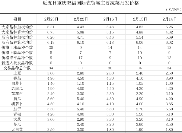双福国际农贸城2026年2月23日蔬菜算数批发价环比平稳