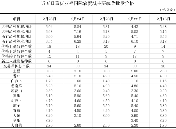 双福国际农贸城2026年2月25日蔬菜算数批发价环比小幅上涨