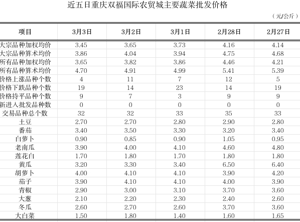 双福国际农贸城2026年3月3日蔬菜算数批发价环比平稳