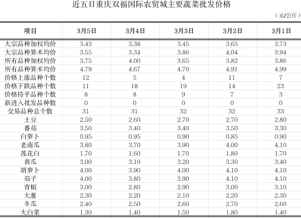 双福国际农贸城2026年3月5日蔬菜算数批发价环比平稳
