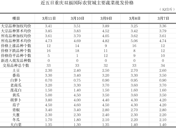 双福国际农贸城2026年3月11日蔬菜算数批发价环比平稳