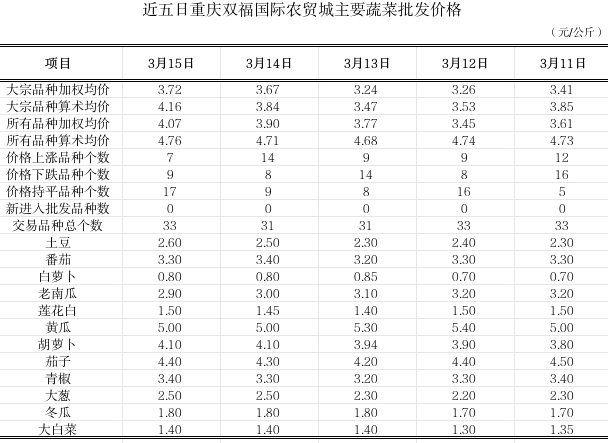 双福国际农贸城2026年3月15日蔬菜算数批发价环比平稳