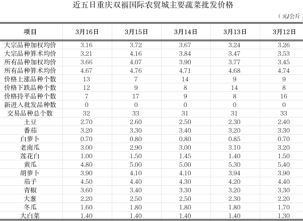 双福国际农贸城2026年3月16日蔬菜算数批发价环比平稳