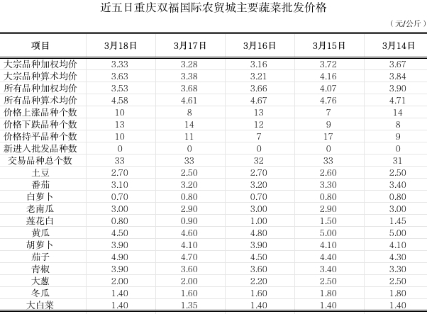 双福国际农贸城2026年3月18日蔬菜算数批发价环比平稳