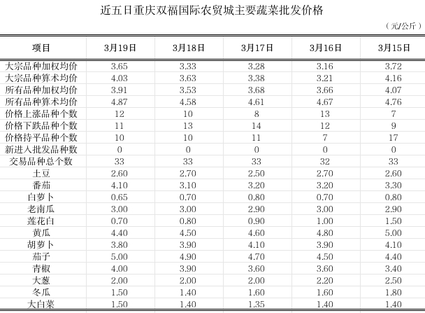 双福国际农贸城2026年3月19日蔬菜算数批发价环比小幅上涨