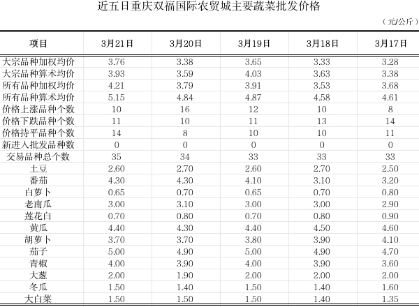 根据重庆市农业信息中心对我市最大蔬菜批发市场--双福国际农贸城蔬菜批发价格监测,当日市场35个监测品种,蔬菜总体算数均价5.15元(公斤价,以下同),与上一日比上浮0.39%、表现平稳;与上一周日均价比上涨9.11%。总体加权均价4.21元,与上一日比明显上涨10.21%;与上一周日均价比明显上涨11.08%。当日大宗交易品种22个,大宗蔬菜算术均价与上一日比上涨9.47%;加权均价与上一日比明显上涨11.24%。