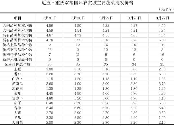根据重庆市农业信息中心对我市最大蔬菜批发市场--双福国际农贸城蔬菜批发价格监测,当日市场35个监测品种,蔬菜总体算数均价4.78元(公斤价,以下同),与上一日比下跌8.43%;与上一周日均价比下跌8.95%。总体加权均价4.67元,与上一日比下滑1.27%、表现平稳;与上一周日均价比略涨3.32%。当日大宗交易品种21个,大宗蔬菜算术均价与上一日比上浮1.10%、表现平稳;加权均价与上一日比上浮1.33%、表现平稳。