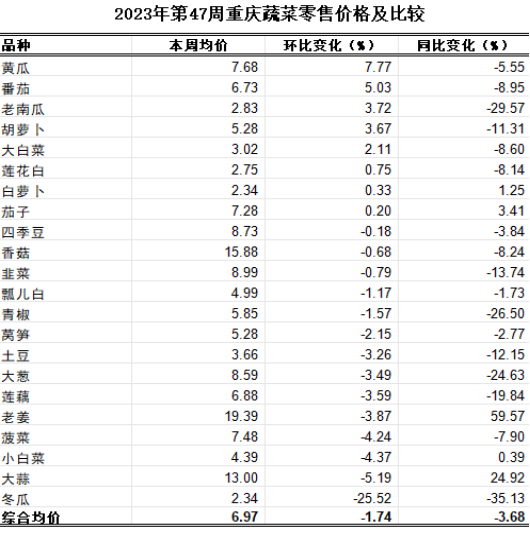 第47周重庆市各区县农贸市场22个蔬菜监测品种零售均价6.97元,环比下滑1.74%、表现平稳,同比略跌3.68%。本周蔬菜零售市场持续平稳态势,所有品种波动幅度均不大。分品种看,5涨9跌8平稳。冬瓜环比明显下跌25.52%。其余品种波动幅度在10.00%以内。