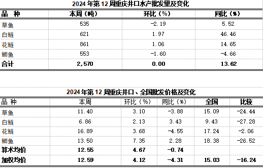 据市农业农村委监测,第12周井口水产批发市场四种大宗水产(草鱼、白鲢、花鲢、鲫鱼)批发总量2570吨,批发总量环比持平,同比增加13.62%。总体加权批发均价12.59元/公斤,环比上涨4.12%,同比下跌4.31%。井口市场与全国相比价格低16.24%。五大批发市场均价16.07元/公斤,和全国相比高6.92%。