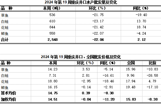 据市农业农村委监测,第19周井口水产批发市场四种大宗水产(草鱼、白鲢、花鲢、鲫鱼)批发总量2548吨,批发总量环比减少22.06%,同比增加2.12%。总体加权批发均价14.51元/公斤,环比下滑0.04%、表现平稳,同比下跌11.20%。井口市场与全国相比价格低8.38%。五大批发市场均价17.29元/公斤,和全国相比高9.22%。