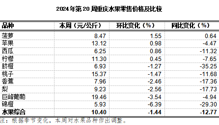 第20周我市各区县农贸市场10个大宗、时令水果监测品种总体零售均价10.40元,环比下滑1.44%、表现平稳,同比下跌12.77%。天气转热,葡萄、菠萝、桃子等应季新鲜水果上市量增加,柑橘类水果售卖接近尾声。分品种看环比4跌6平稳。锦橙、巨峰葡萄、梨子、香蕉环比跌6.39%、3.54%、2.56%、2.46%。其余水果品种表现平稳。