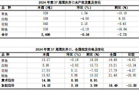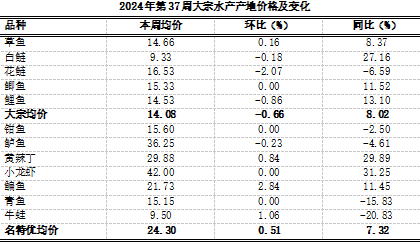 据市农业农村委监测,第37周重庆大宗水产产地均价14.08元/公斤,环比下滑0.66%、表现平稳,同比上涨8.02%。由于持续高温天气,长途运输损耗和成本相应增加,外地鱼供应减少,本地鱼销售周期拉长,近期由于中秋节消费拉动,养殖户出鱼积极性高,市场供应充足,价格整体平稳波动。名特优水产均价24.30元/公斤,环比上浮0.51%、表现平稳,同比上涨7.32%。