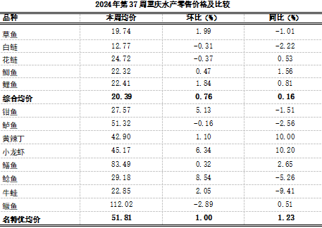 据市农业农村委监测,第37周重庆大宗水产零售均价20.39元/公斤,环比、同比分别上浮0.76%、0.16%,表现均平稳。名特优水产均价51.81元/公斤,环比、同比分别稳中略涨1.00%、1.23%。