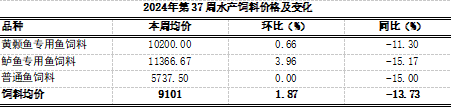 据市农业农村委监测,第37周水产饲料均价9101元/吨,环比稳中略涨1.87%,同比下跌13.73%,其中黄颡鱼专用鱼饲料、普通鱼饲料均平稳,鲈鱼专用鱼饲料上涨3.96%。