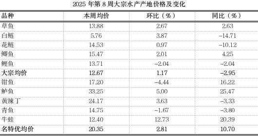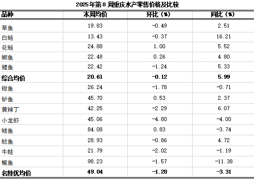 据市农业农村委监测,第8周重庆大宗水产产地均价12.67元/公斤,环比稳中略涨1.17%,同比小幅下跌2.95%。由于节日效应消退,集体性聚餐活动减少,水产需求下降,但养殖户出鱼积极性较弱,出塘量不高,供需趋于平衡,市场价格整体稳定。名特优水产均价20.35元/公斤,环比小幅上涨2.81%,同比上涨10.70%。