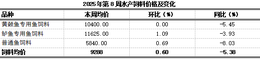 据市农业农村委监测,第8周水产饲料均价9288元/吨,环比上浮0.60%,同比下跌5.38%,其中黄颡鱼专用鱼饲料、普通鱼饲料均平稳,鲈鱼专用鱼饲料稳中略涨1.09%。