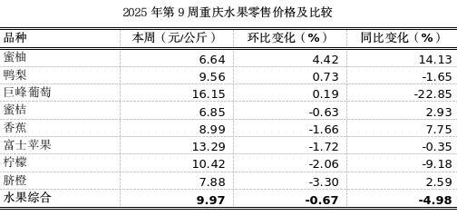 第9周我市各区县农贸市场8个大宗、时令水果监测品种总体零售均价9.97元,环比下滑0.67%、表现平稳,同比下跌4.98%。本周水果市场供应品种丰富,草莓、蓝莓、葡萄、芒果陆续上市,本地水果仍以晚熟柑橘为主,价格整体稳定。蜜柚上涨4.42%、脐橙、柠檬、富士苹果、香蕉分别下跌3.30%、2.06%、1.72%、1.66%,其余水果价格保持平稳。