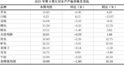 据市农业农村委监测,第9周重庆大宗水产产地均价12.61元/公斤,环比下滑0.50%,同比稳中略涨1.49%。由于节日效应消退,集体性聚餐活动减少,水产需求下降,加之最近气温变化频繁,鱼类生长受影响,养殖户出鱼积极性较弱,出塘量不高,供需趋于平衡,市场价格整体稳定。名特优水产均价19.99元/公斤,环比稳中略跌1.80%,同比上涨10.18%。