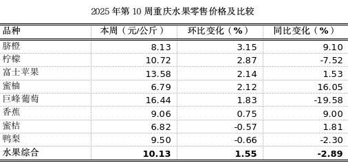 第10周我市各区县农贸市场8个大宗、时令水果监测品种总体零售均价10.13元,环比略涨1.55%,同比下跌2.89%。本周水果市场供应品种丰富,草莓、蓝莓、葡萄、芒果陆续上市,本地水果仍以晚熟柑橘为主,价格整体稳定。其中脐橙、柠檬、富士苹果、蜜柚、分别涨3.15%、2.87%、2.14%、2.12%,其余水果价格保持平稳。