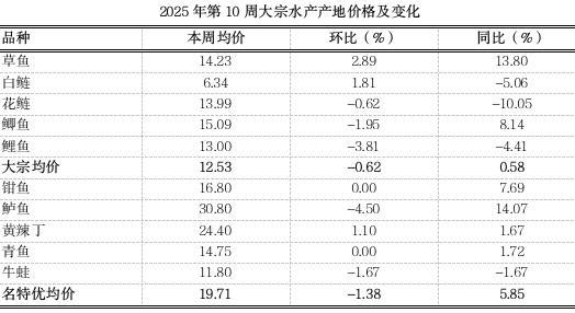 据市农业农村委监测,第10周重庆大宗水产产地均价12.53元,环比下滑0.62%,同比上浮0.58%,表现均平稳。随着气温逐渐增高,鱼类进入产卵繁殖季节,常见鱼病发生率增高,出塘量整体不高,加之近期消费市场较为平淡,需求较弱,供需基本平衡,市场价格整体稳定。名特优水产均价19.71元/公斤,环比稳中略跌1.38%,同比上涨5.85%。