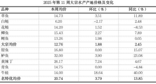据市农业农村委监测,第11周重庆大宗水产产地均价12.76元/公斤,环比稳中略涨1.88%,同比小幅上涨2.45%。春季气温变化大,鱼类进入产卵繁殖季节,常见鱼病发生率增高,出塘量受到一定影响,加之近期消费市场较为平淡,需求较弱,供需基本平衡,市场价格整体平稳波动。名特优水产均价20.74元/公斤,环比上涨3.79%,同比上涨13.85%。