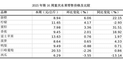 第16周我市各区县农贸市场10个大宗、时令水果监测品种总体零售均价10.30元,环比上浮0.24%、表现平稳,同比上涨4.63%。我市地产柑橘销售进入尾期,菠萝、西瓜等新鲜时令水果上市,水果供应丰富,价格持续平稳,各品种波动幅度均不大。其中脐橙、柠檬、蜜桔、香蕉分别涨6.06%、4.17%、3.36%、2.01%,蜜柚、西瓜、巨峰葡萄分别下跌7.82%、3.55%、2.26%,其余水果价格保持平稳。