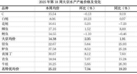 据市农业农村委监测,第18周重庆大宗水产产地均价14.38元,环比小幅上涨2.35%,同比稳中略涨1.91%。随着气温逐渐升高,储存运输成本增加,五一长假期间,旅游消费人数增多,餐饮备货需求显著上升,推动价格整体向上运行。名特优水产均价25.22元,环比上涨7.34%,同比上涨19.20%。
